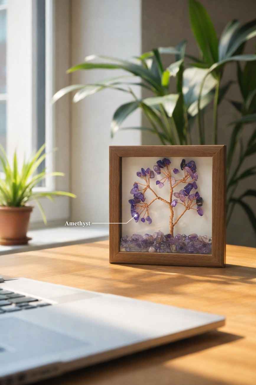About the Product: This Amethyst Tree Frame is not just a decorative piece – it is a handcrafted creation made by our artisans at Amantra. Each natural Amethyst crystal chip is carefully placed by hand to form a graceful tree design that represents peace, spiritual growth, and inner harmony.